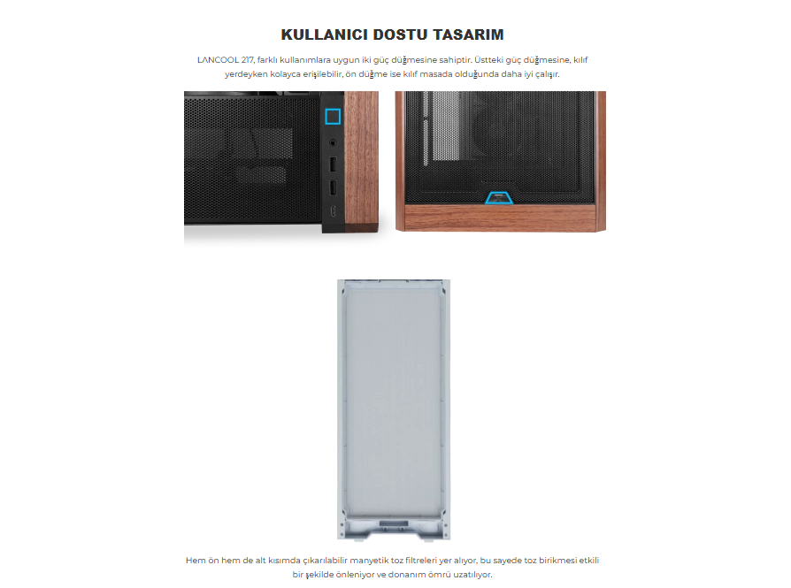 Zamansız Zarafet, Sonsuz PerformansLANCOOL 217, yenilikçi soğutma tasarımını gerçek ahşap detaylarla birleştiren bir orta boy kule kasadır. Beş fanla birlikte gelir ve kutudan çıktığı anda optimize edilmiş hava akışı sağlar. Esnek PSU montaj tasarımı, kablo yönetimini kolaylaştırır. Koyu ahşap detaylarla Siyah veya açık ahşap detaylarla Beyaz seçenekleriyle sunulan bu kasa, doğal güzelliği yüksek performansla birleştirir.