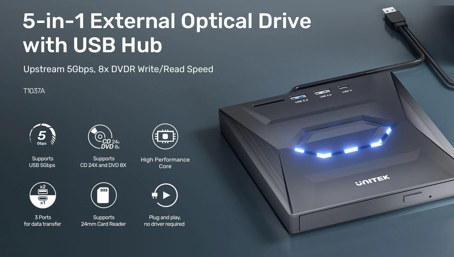 UNITEK HARİCİ DVD-RW USB TYPE-C/A 5in1 DOCK (T1037A)