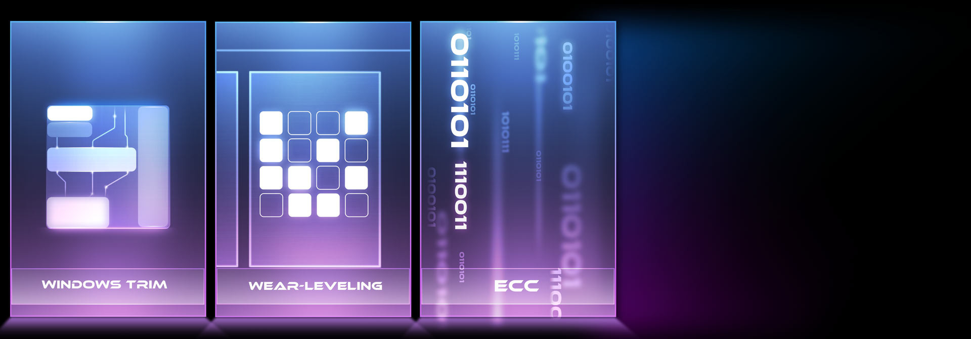 Windows TRIM SSD Optimizasyonu, iletim ve yazma performanslarını hızlandırmak için serbest bırakıldığında Free Block'un kullanılmasını sağlar. Aşınma dengeleme teknolojisi ve ECC, SSD ömrünü uzatırken veri iletim güvenilirliğini artırır.