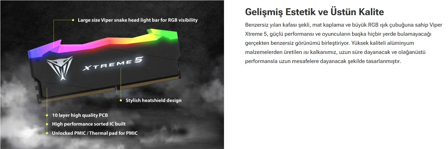 Viper Xtreme 5 DDR5 kitiyle donanımınızın estetiğini yükseltin. Dinamik RGB ışık çubuğu yalnızca aydınlatma değil, aynı zamanda sanatsal bir tuvaldir. Uyumlu bir kurulum için Viper RGB Sync'i kullanarak aydınlatma efektlerini senkronize edin. RGB olmayanı mı tercih ediyorsunuz? Çeşit ile gelişmişliği seçin. Oyun deneyiminizi yeniden tanımlamak için yeniliği, kişiselleştirmeyi ve performansı açığa çıkarın.TEKNİK ÖZELLİKLER